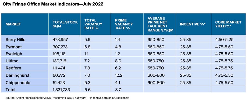 “The city fringe is now seen as a natural extension to the CBD, but also a market growing organically in its own right with a distinctly different feel. The sub 2% vacancy for prime space in Surry Hills and Eveleigh evidences the fringe market’s potential to catch up with more established precincts,” said Knight Frank associate director Marco Mascitelli.
