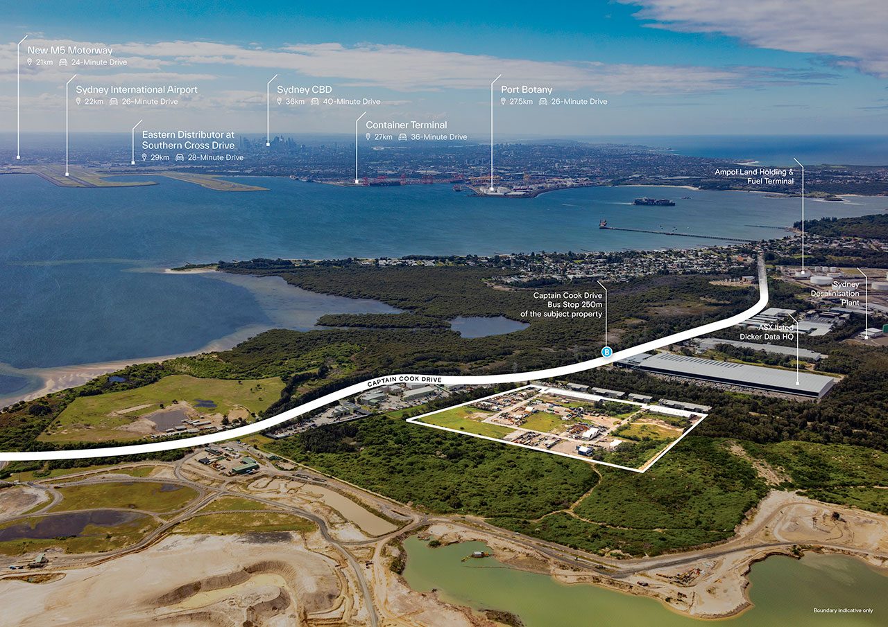 Located about 21 kilometres south of the CBD, the property at 260B Captain Cook Drive in Kurnell contains two warehouse buildings totalling 5,213 sqm and extensive hardstand areas, and is zoned E4 general industrial.