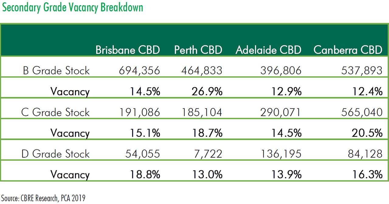 SECONDARY grade office markets in Perth, Brisbane, Adelaide and Canberra are suffering from high levels of vacancy and have recorded zero or negative net effective rental growth over recent years, as a number of buildings age.